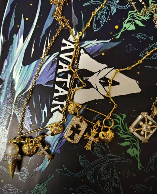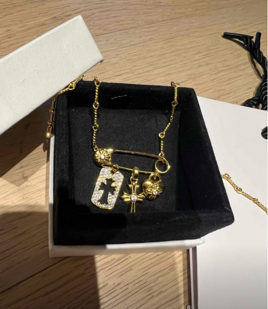 The inspiration for this necklace comes from the collision of punk culture and romantic elements - the pin was originally a practical tool in the industrial age, but it became a symbol of "rebellious expression" in the punk wave; We combine it with romantic elements such as crosses, hearts, and portrait cards, turning "rebellious utilities" into "gentle style carriers", and rubbing contradictions into everyday wear.